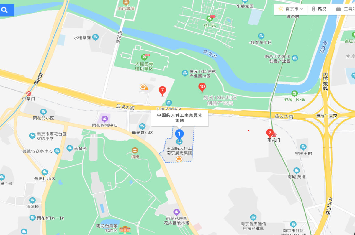 中国航天科工南京晨光集团(以下简称“公司”)隶属于世界500强、世界军工10强企业中国航天科工集团,是国有大型军工央企,位于江苏南京风景秀丽的雨花台旁、秦淮河畔,为“南京市园林式单位”。公司前身是中国近代洋务运动时期两江总督李鸿章于1865年创办的金陵机器制造局,至今已有157年的历史,是我国最早的四大兵工厂之一,被誉为近代民族工业的摇篮。公司目前主要从事国家重点航天产品和民用高端智能装备的研制生产,拥有2家控股子公司、3家研究所、4家参股公司、11家分公司及分厂。公司位于南京市主城秦淮区,交通便利,占地面积2500亩,建筑面积38万平方米,总资产100多亿元。
