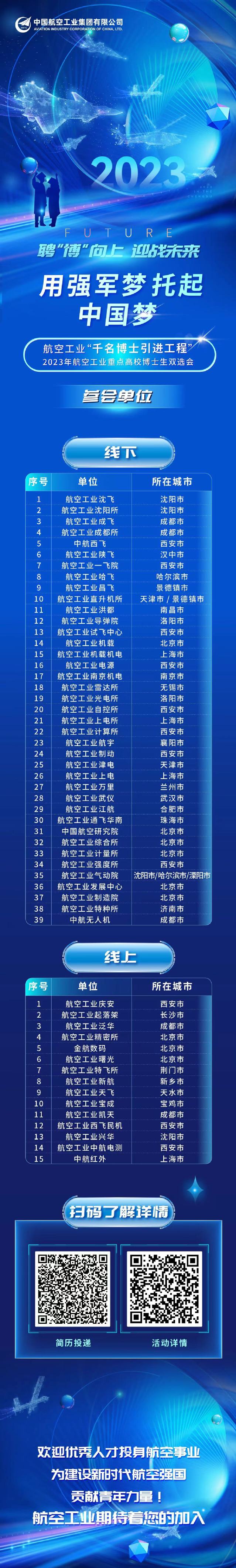 中国航空工业集团有限公司《航空工业“千名博士引进工程”2023年航空工业重点高校博士生双选会参会单位名单》